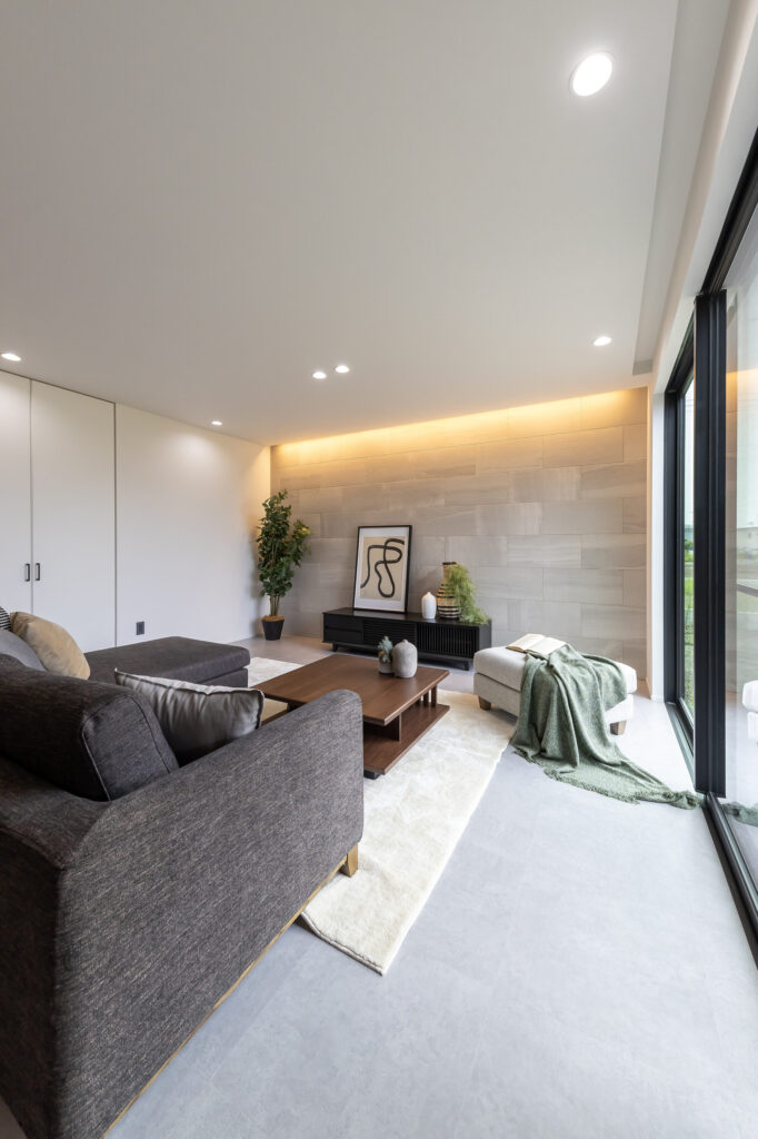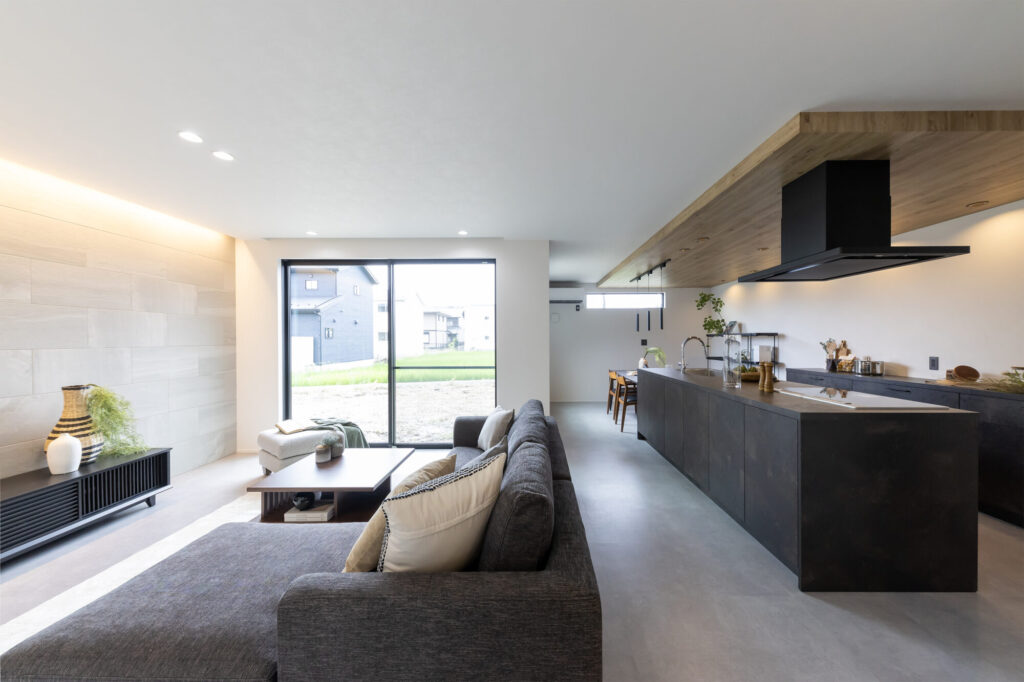庭と繋がる大きな窓とそれを囲うように配置したL字のLDK