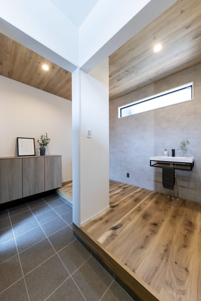• 脱衣室兼ランドリーには自在棚を造作し、タオルや着替えを置けるスペースを配置