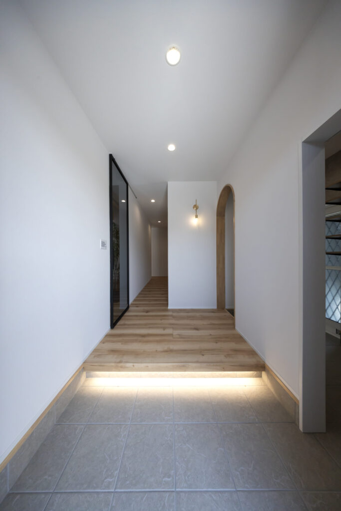 • 足下を照らす照明が美しい玄関 収納からはガレージへとつながります
