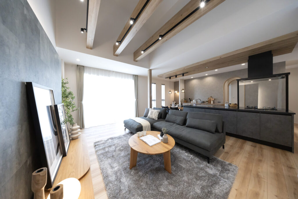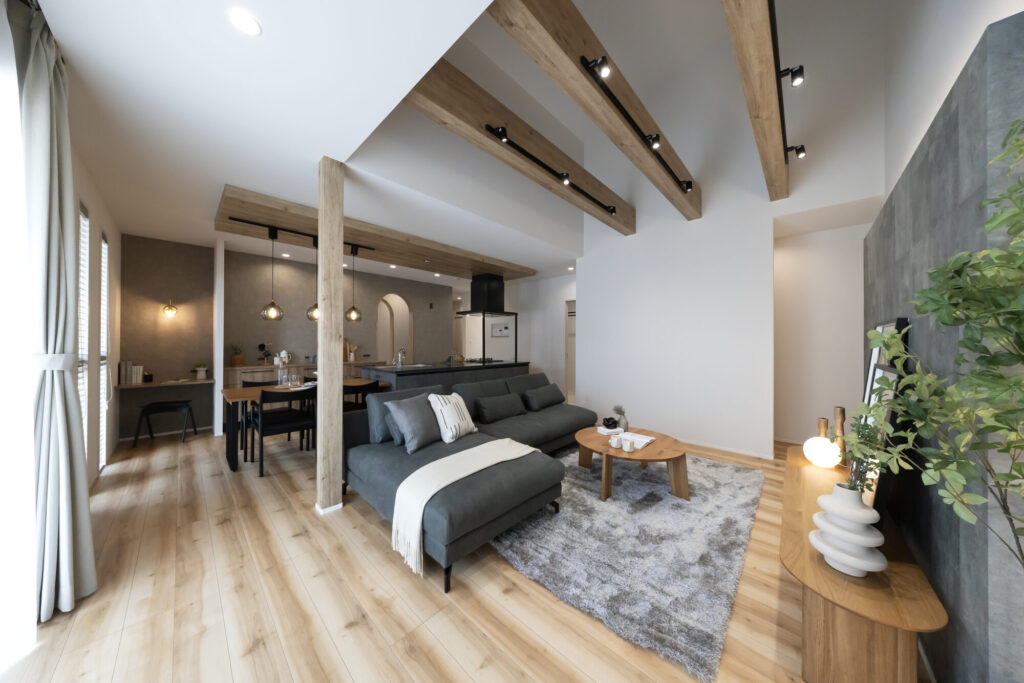 吹き抜けになった天井と大きな窓が空間を広く開放的に演出