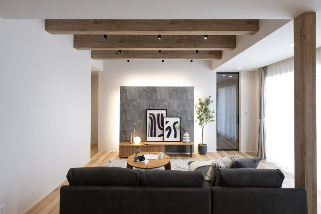 • 背面に造った壁が奥行きと立体感をもたらすテレビコーナー