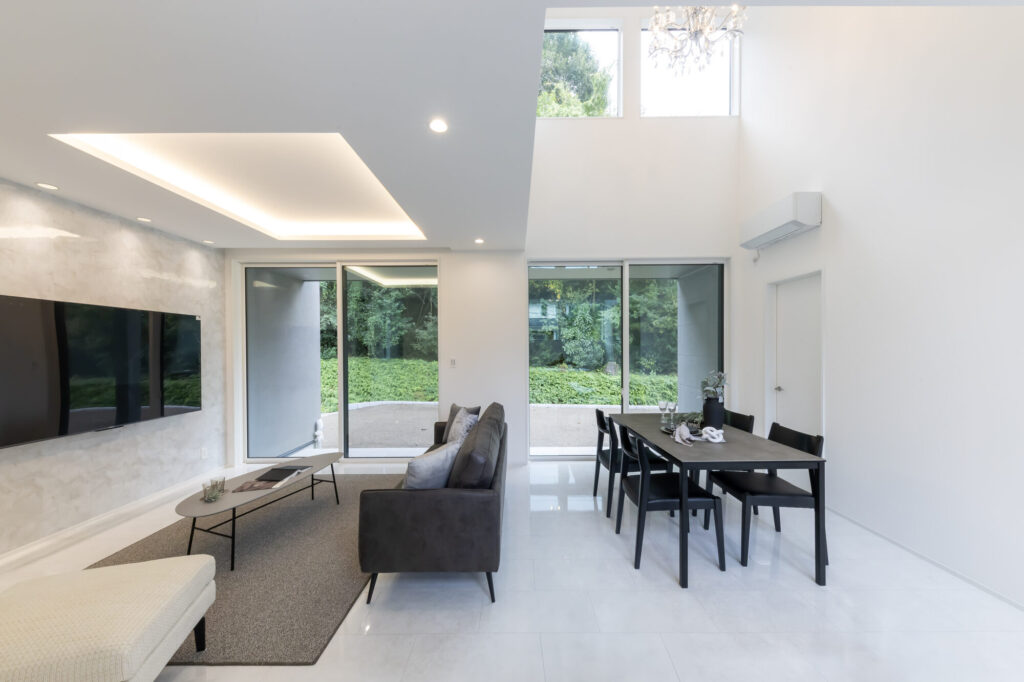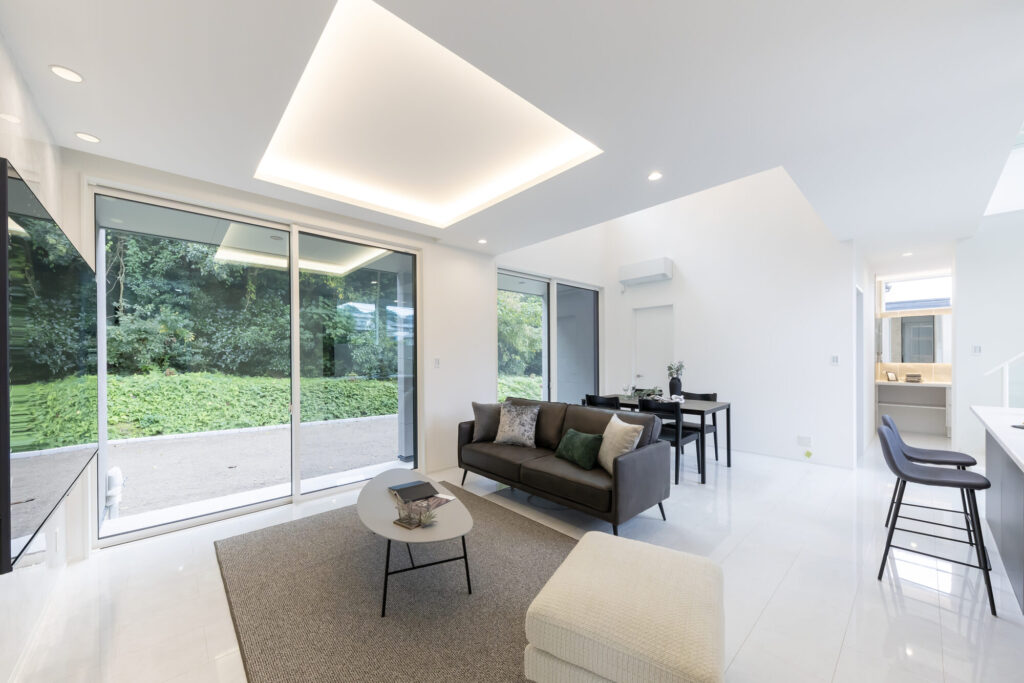 並んだ大きな窓からは外のタイルデッキまでが一体となり、より広々とした空間に