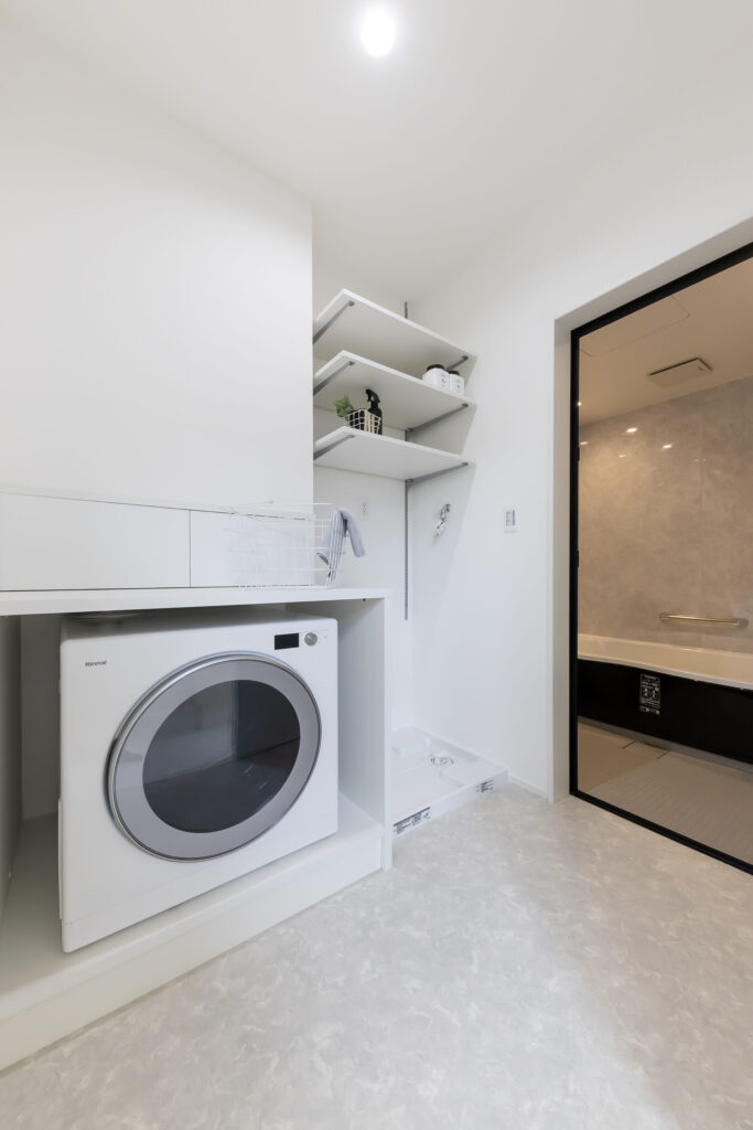 • 乾燥機の上に収納を造作し、物が見えない仕様のランドリー