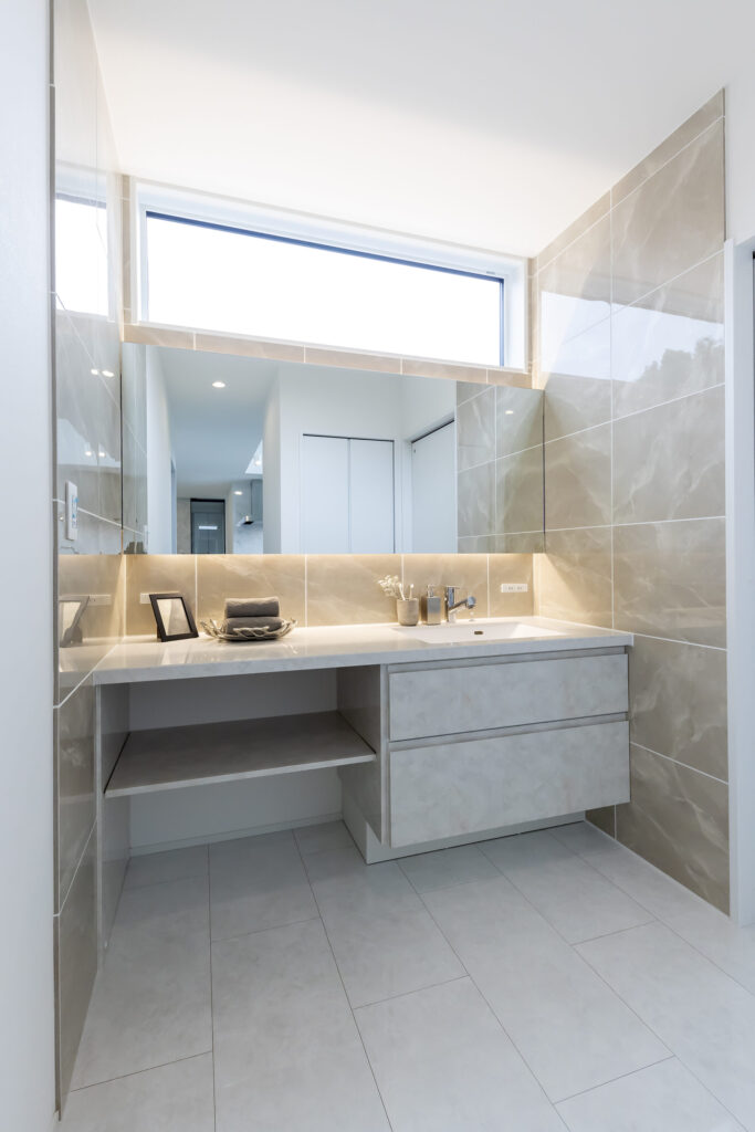 • ホテルのような雰囲気の洗面台はタイルでメンテナンス性も◎