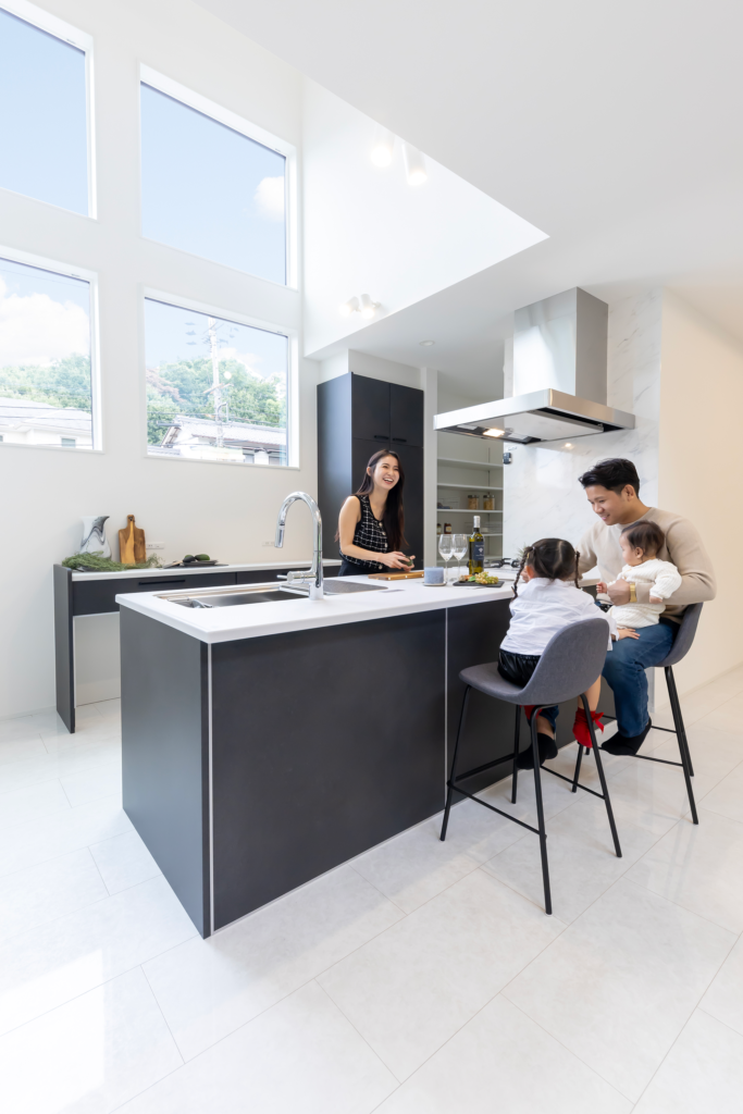 • キッチンの上部には家の主役となる吹き抜けを設けて開放感満点