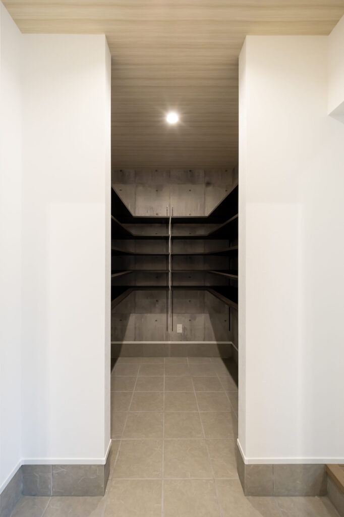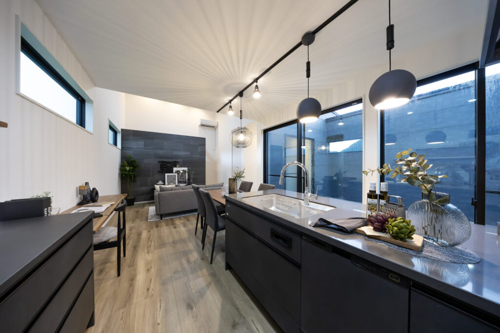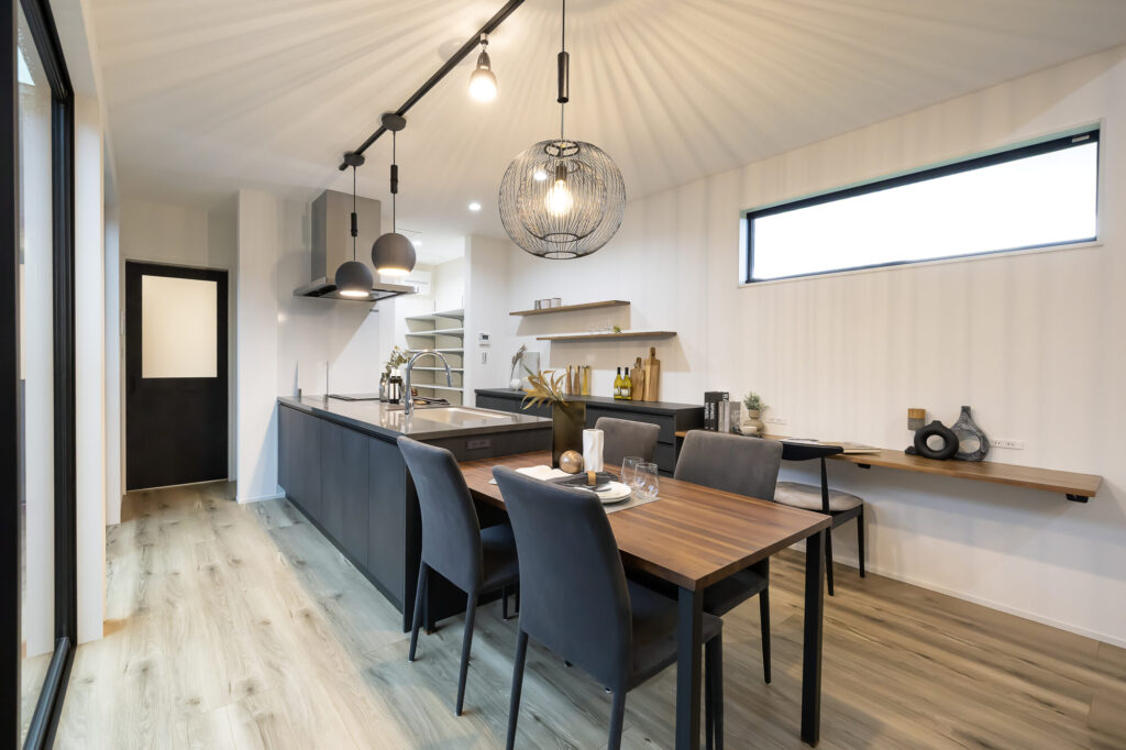 照明の陰影が美しいダイニング 冷蔵庫ごとパントリーに隠してキッチン回りもスッキリ