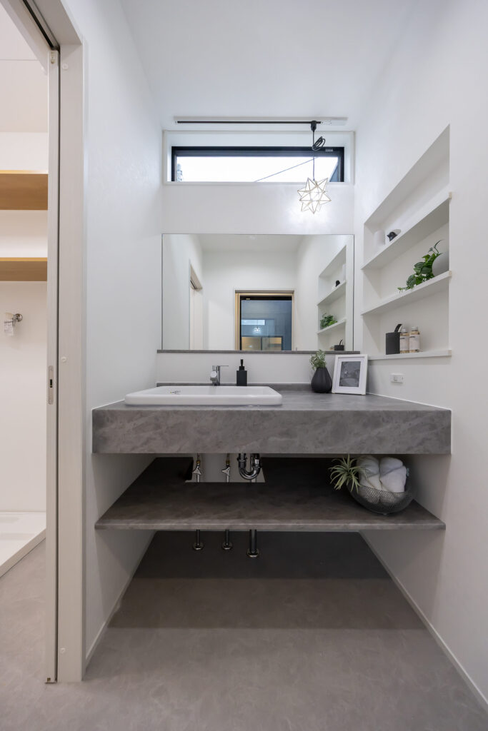 白を基調に清潔感ある洗面台 壁面のニッチでカウンターも広く使えます