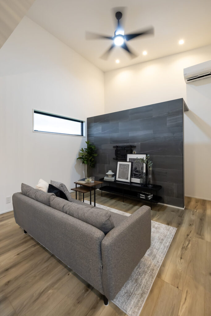リビングの一部は勾配天井で高さを出して空間をタテに延長