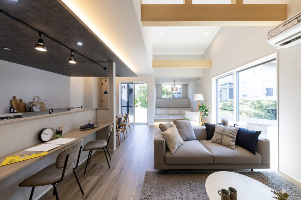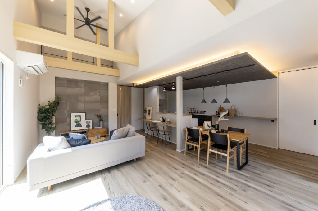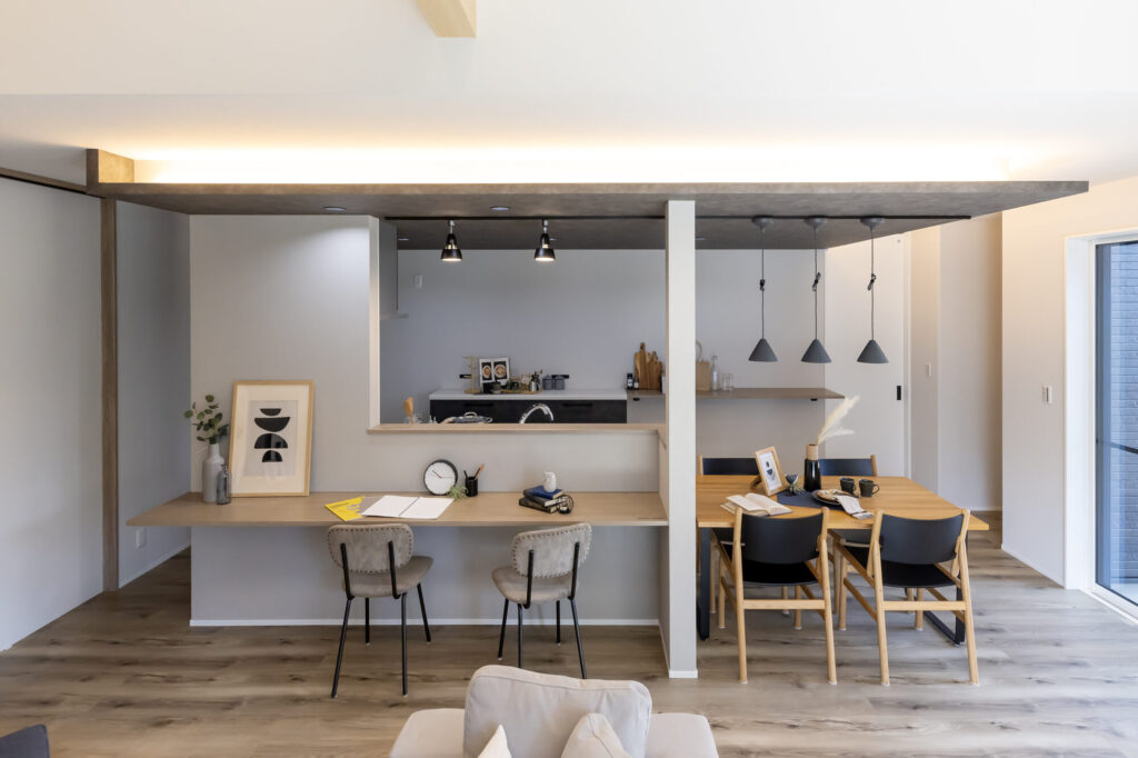 空間に明るさと彩りを加える梁見せと間接照明がアクセント
