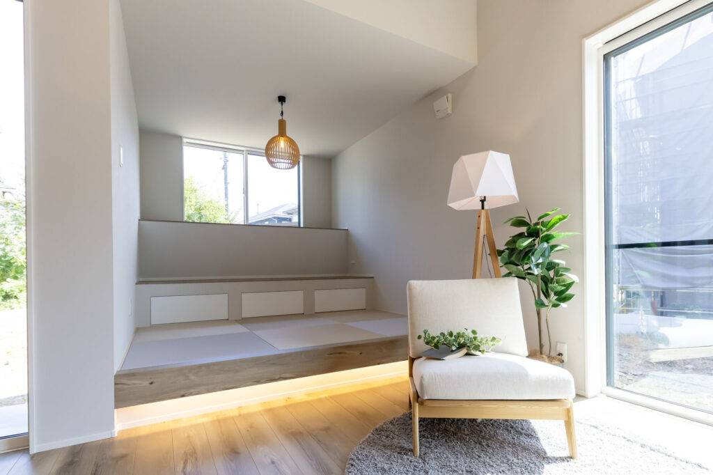 余白のあるリビングはソファ以外にもくつろぎスペースがあり、子どもの遊び場としても活躍